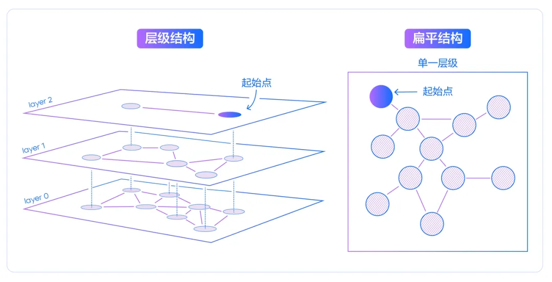 2024年,火山引擎云搜索团队就发现了 DiskANN 算法在市场需求中的潜力,推出高性价比的百亿级海量向量数据检索方案。DiskANN 和 HNSW 都是向量检索的优秀算法,HNSW 就像一座复杂的多层迷宫,凭借多层结构设计,能让计算机快速找到目标数据,但数据需要在多层迷宫里频繁检索,这就要求数据需要存放在高性能存储介质上,一旦数据量增大,硬件开销就会直线上升。而 DiskANN 则是单层图设计,天生适合把数据存在硬盘里,这就大大降低了存储成本,不过,在一些对检索性能要求高的场景下,它的速度还不够快。