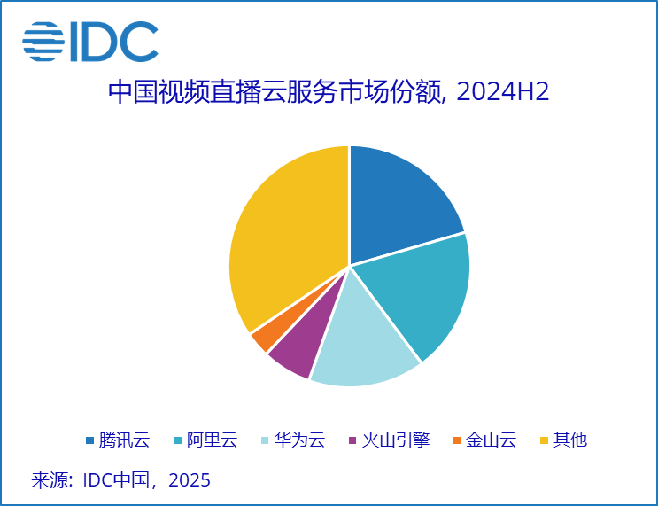 其中,视频直播云服务市场中,腾讯云、阿里云、华为云、火山引擎、金山云合计市场份额环比提升,本期达到65.5%。