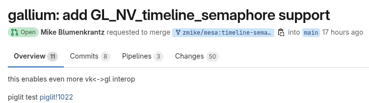 通过目前正在等待处理的合并请求,Zink 能够在任何支持标准 VK_KHR_timeline_semaphore 的硬件/驱动程序上支持 NV_timeline_semaphore。这将进一步增强依赖互操作性的工作流程,并消除对二进制信号量的需求。更多详情,请参阅Blumenkrantz 的这篇博文。