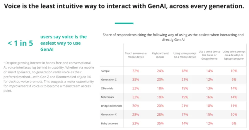 根据《Generation AI: Why Gen Z Bets Big and Boomers Hold Back.》报告的补充数据,在接受调查的各年龄段用户中,只有不到20%的人认为语音是使用 AI 工具的最简单方法。