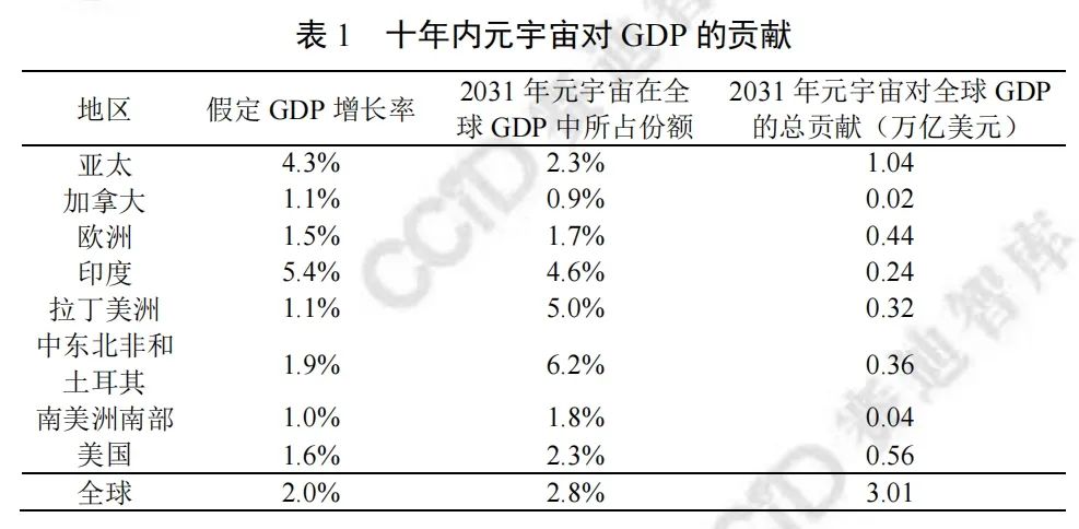 【译者按】今年7月,Meta(原名Facebook)发布《元宇宙对全球经济的潜在影响》研究报告。当前,元宇宙概念成为全球科技、产业和资本界高度关注的热点方向,全球科技巨头均已布局。随着元宇宙底层技术与基础设施加速成熟,其有望带动全球经济高速增长。报告预测,到2031年元宇宙将为全球GDP贡献3.01万亿美元,其中1/3来自亚太地区。报告认为,当前元宇宙仍处于萌芽期,各国均处于布局元宇宙基础设施和底层技术阶段。随着元宇宙的支撑技术成熟,其将取代一些现有的技术和产业,以不可预测的方式加速社会发展。赛迪智库电子信息研究所对该报告进行了编译,期望对我国有关部门有所帮助。