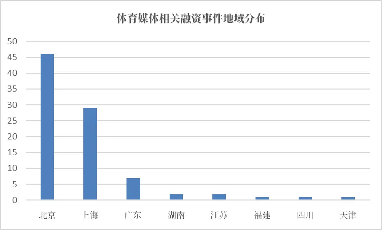 而从体育媒体相关初创企业融资事件地域分布来看,北京以及上海两地占据绝对优势,这与两地文化传媒产业发达不无关系。
