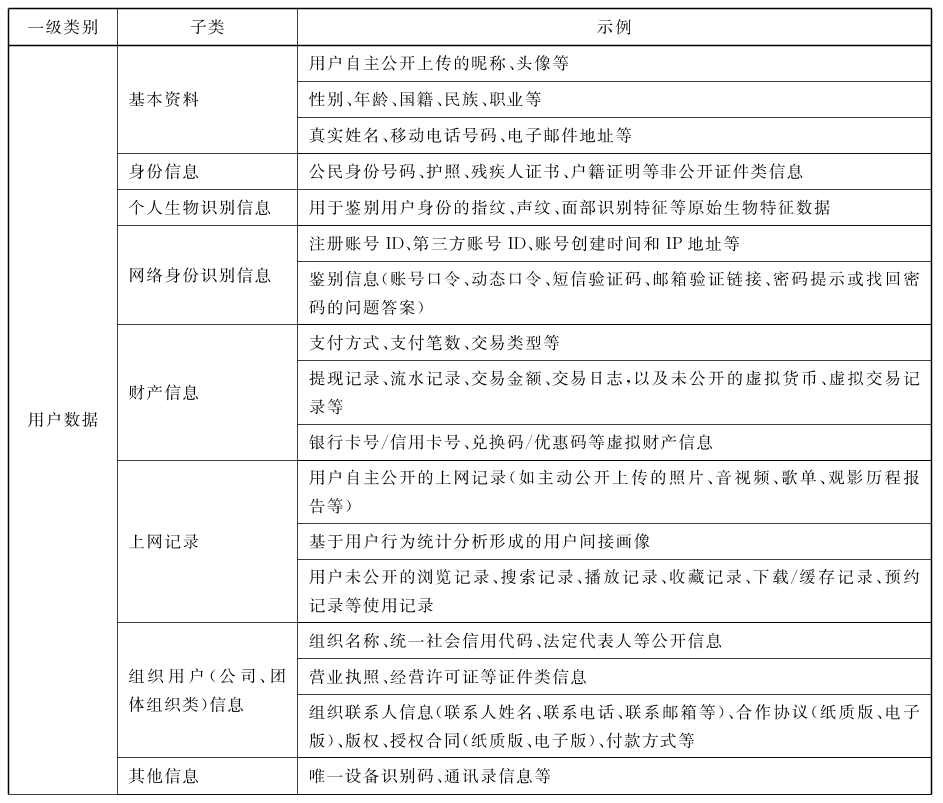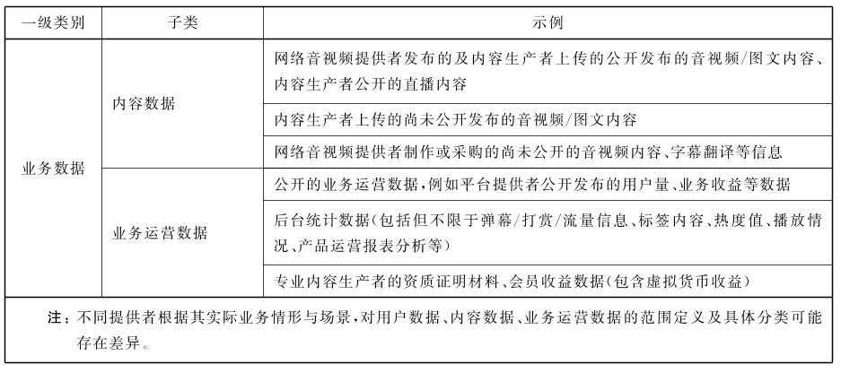 网络音视频服务数据范围可以分为用户数据和业务数据两大类,用户数据包括网络音视频服务提供者在提供网络音视频服务过程中收集和产生的用户的个人信息,如用户的基本资料、身份信息、浏览、搜索、播放记录等;业务数据主要指网络音视频服务提供者在提供网络音视频服务过程中处理的除用户数据外的其他数据,包括内容数据和业务运营数据。以下为网络音视频服务数据分类示例: