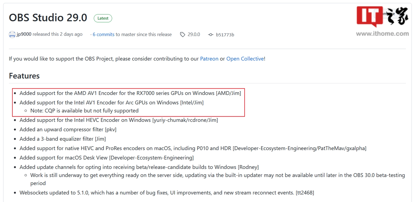 此外,更新日志还称,OBS Studio 29 正式版也支持了 Windows 平台的英特尔 HEVC 编码,也就是大家熟知的 H.265 编码,以及对 macOS 上原生 HEVC 和 ProRes 编码器的支持。