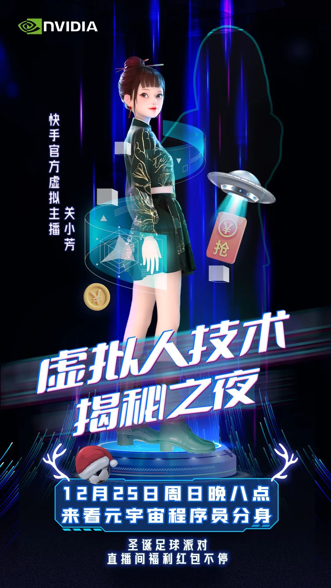 12 月 25 日,快手与 NVIDIA 强势联合,邀请虚拟主播关小芳与它背后的 NVIDIA 程序员小姐姐 Alice,与广大粉丝玩黑科技过圣诞!真人与虚拟主播的完美碰撞,恰逢世界杯刚刚落下帷幕,本场直播还引入了虚拟足球赛,与在线粉丝同频互动,更有多种魔法表情的玩法挑战,只为带给粉丝最好的互动体验。