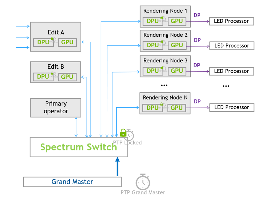 腾讯 CDD 综合 NVIDIA 提供的各项产品,使用 NVIDIA RTX A6000 实时渲染,使用 NVIDIA Rivermax 在 GPU 显存间直接传输数据,使用 NVIDIA BlueField-2 DPU 部署精确时间服务 DOCA Firefly 来同步所有渲染节点的系统时钟,使用 NVIDIA Spectrum-3 交换机复制 GPU 显存数据并承载时钟网络,通过这一系列改进措施,最终实现了在 LED 立面屏幕上以超低延迟呈现数字流资产的能力。