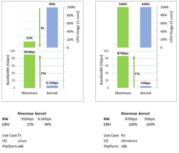 NVIDIA Rivermax 提供了高性能的流媒体传输服务,这种服务在 Windows 平台上实现了 GPU Direct P2P 支持,消除了额外的 GPU 显存到系统内存的拷贝,降低了操作系统层面的延迟,同时也降低了 CPU 资源的占用,从而让整个渲染平台的运行更为可靠。启用 NVIDIA Rivermax 后,单颗 CPU 核心可以轻松收发 100Gbps 的媒体流。