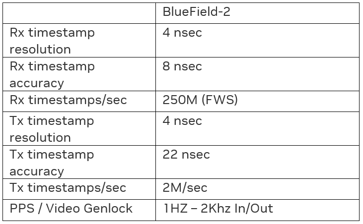 而且整个平台也具备了部署 DOCA Firefly 的条件。DOCA Firefly 是 NVIDIA 提供的基于硬件的精确时间同步服务。在 NVIDIA BlueField-2 DPU 上部署 DOCA Firefly 可以实现纳秒级别的时间同步精度,其典型值如下表所示: