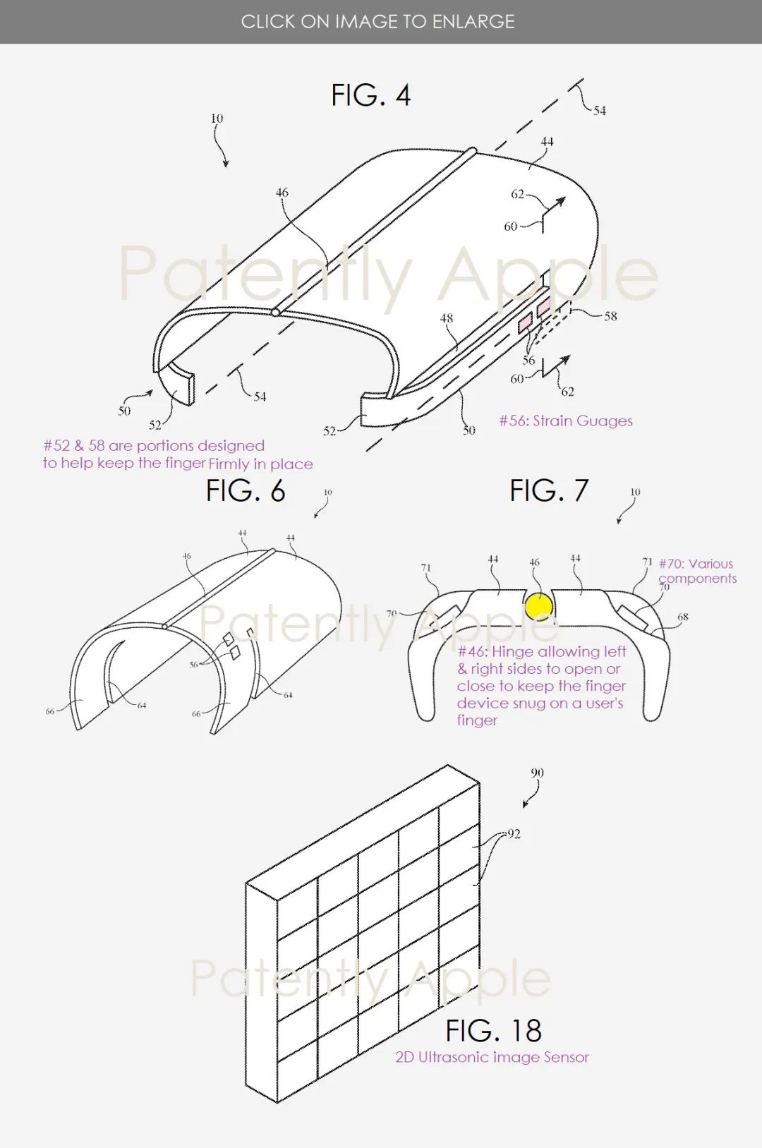 根据苹果的说法,手指设备可能包括带有加速度计的惯性测量单元,用于收集有关手指轻敲或自由空间手指手势等图形运动的信息。手指设备可以包括用于收集关于手指设备和用户手指中的法向力和剪切力的信息的力传感器。手指设备可以包括触觉输出设备以向用户的手指提供触觉输出并且可以包括其他输出组件。