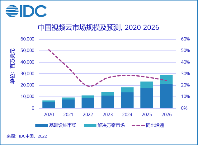 近日,全球领先的IT市场研究和咨询公司IDC发布的《中国视频云市场跟踪(2022上半年)》报告显示,2022上半年中国视频云市场规模达到50.5亿美元(约353亿元人民币),同比增长15.7%。头部客户入局视频云市场,甚至是整个公有云计算市场,正在改变远期视频云市场的底层增长逻辑。